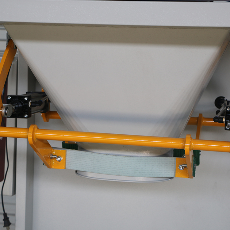 當(dāng)料袋一旦到稱裝滿,其夾袋器通過控制系統(tǒng)打開,料袋通過輸送帶送走,由人工扶助封口糧食包裝秤